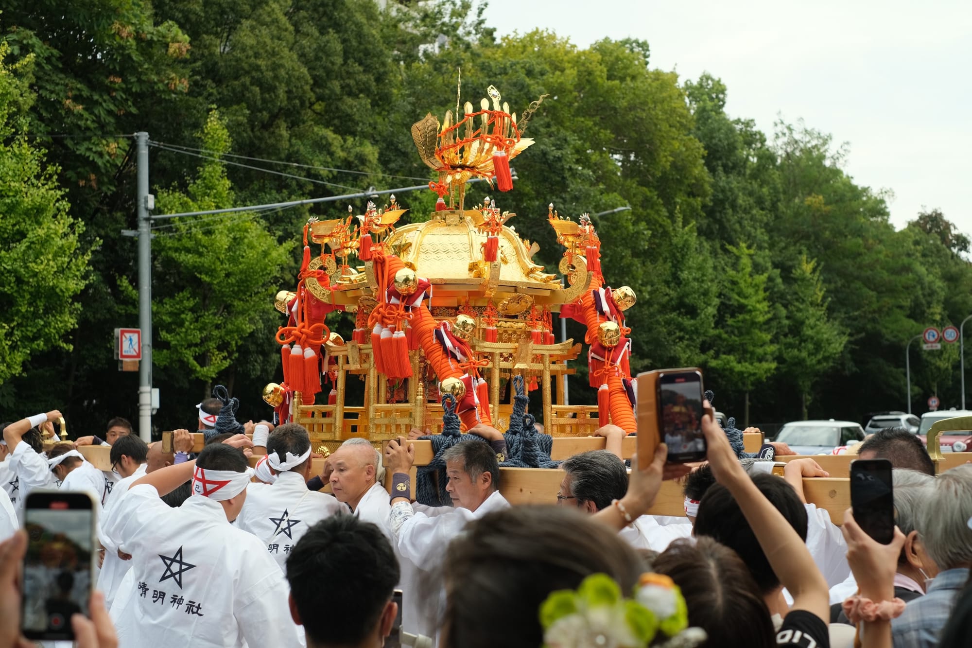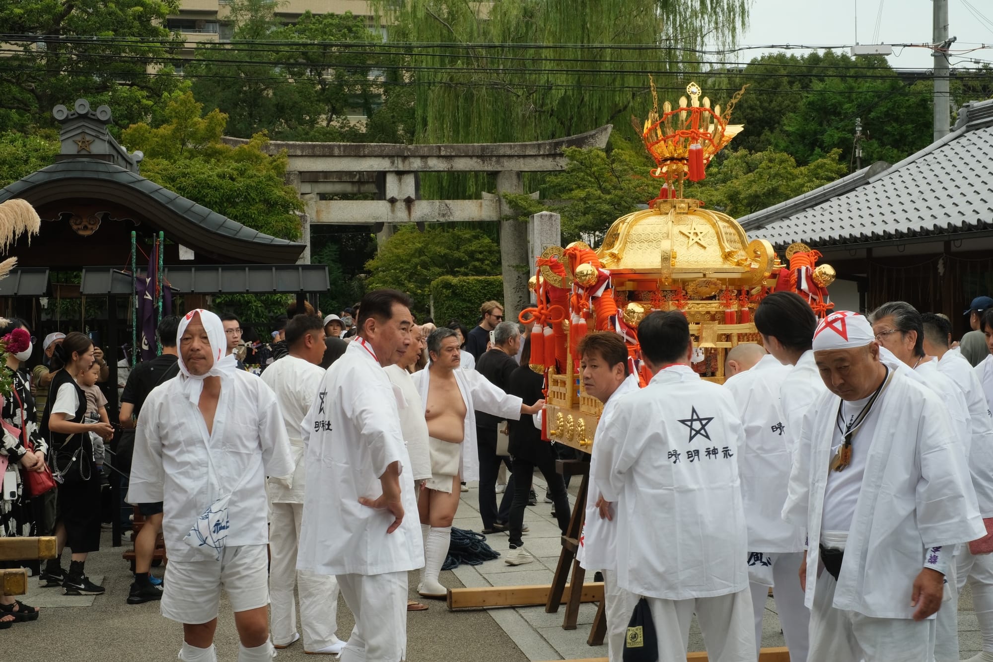 The crowd’s excitement grew as the children’s mikoshi passed by, and behind them, the men’s mikoshi followed with incredible energy. When they departed from Seimei Shrine, the air was alive with spirit and power.
